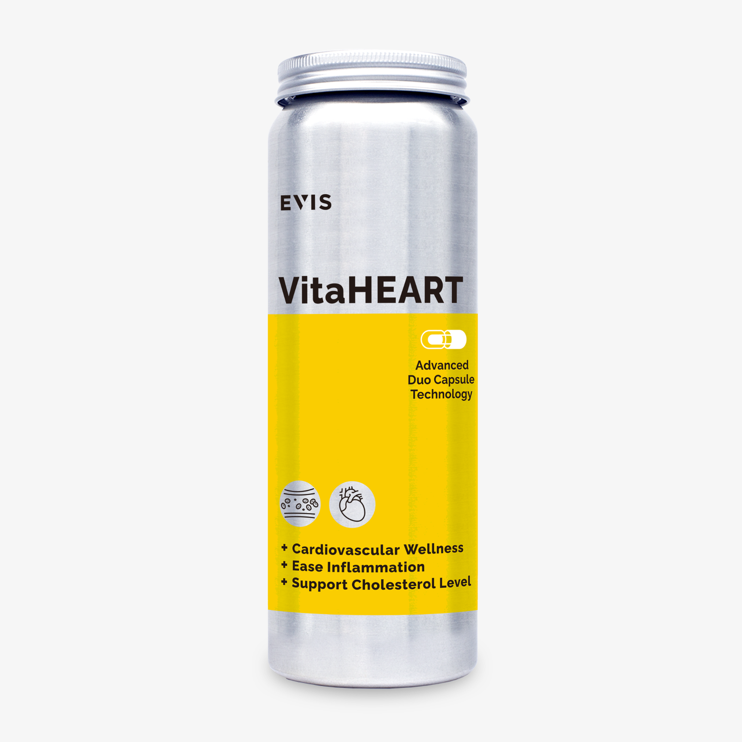 歐洲研發、生產及品質檢測,EVIS VitaHEART養心之寶二合一 DuoCap®膠囊特別加入富含Omega-3的「素食魚油」亞麻籽油,以及肉桂、大蒜提取物、輔酶Q10等超强抗氧化物,心血管保健產品的理想選擇,素食人士亦適合。